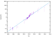 Im zweiten Quartal 2013 wurden weltweit 133 Millionen Festplattenlaufwerke mit einer Gesamtkapazität von 108 Exabyte (108 Millionen Terabyte) abgesetzt.[72] Im Jahr 2014 wurden weltweit 564 Millionen Festplattenlaufwerke mit einer Gesamtkapazität von 529 Exabyte produziert.[73][74] 87,7 Millionen Festplattenlaufwerke wurden weltweit im vierten Quartal 2018 abgesetzt.[75]
