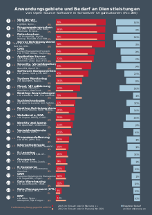 - ↑ Hochspringen nach: a b c d e f g h i Open Source Studie Schweiz 2015. (PDF) swissICT und Swiss Open Systems User Group /ch/open, 3. Juni 2015, abgerufen am 6. März 2020 (Schweizer Hochdeutsch).
