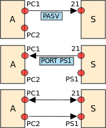 Zum Senden und Empfangen von Dateien sowie zur Übertragung von Verzeichnislisten wird pro Vorgang jeweils eine separate TCP-Verbindung verwendet. FTP kennt für den Aufbau solcher Verbindungen zwei Modi:[1]