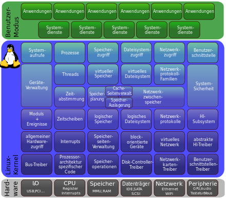 Die Bezeichnung Linux wurde von Linus Torvalds anfänglich nur für den Kernel genutzt, dieser stellt der Software eine Schnittstelle zur Verfügung, mit der sie auf die Hardware zugreifen kann, ohne sie genauer zu kennen. Der Linux-Kernel ist ein in der Programmiersprache C geschriebener monolithischer Kernel, wobei einige GNU-C Erweiterungen benutzt werden. Wichtige Teilroutinen sowie zeitkritische Module sind jedoch in prozessorspezifischer Assemblersprache programmiert. Der Kernel ermöglicht es, nur die für die jeweilige Hardware nötigen Treiber zu laden. Weiterhin übernimmt der Kernel auch die Zuweisung von Prozessorzeit und Ressourcen zu den einzelnen Programmen, die auf ihm gestartet werden. Bei den einzelnen technischen Vorgängen orientiert sich das Design von Linux stark an seinem Vorbild Unix.