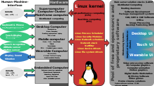 Die Architektur dieser Smartphone- und Tablet-Distributionen hat neben dem Linux-Kernel teilweise wenig mit den klassischen Distributionen zu tun.[26] So wird von Android nur ein Teil der sonst üblichen GNU-Software-Umgebung genutzt.[27] Die meist auf Linux genutzten UNIX-artigen Dienste und Tools werden teilweise durch eine Java-Laufzeitumgebung ersetzt. Dadurch entstehen neue Programmierschnittstellen, die sich auf beliebigen anderen Plattformen emulieren bzw. umsetzen lassen.[28] Trotzdem wird Android als Linux-Distribution angesehen, die viele Eigenschaften mitbringt, die es mit zahlreichen Embedded-Linux-Distributionen teilt.[29] Andere Smartphone-Distributionen, wie etwa Firefox OS, Ubuntu for phones,[30] Maemo, Tizen, Mer, Sailfish OS[31] und MeeGo nutzen größere Teile der klassischen GNU-Software-Umgebung, so dass diese Distributionen teilweise einfacher mit klassischen Linux-Anwendungen ergänzt werden können und somit eher Linux-Distributionen im klassischen Sinne entsprechen.