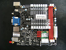 Die Bezeichnung Nettop wird für vergleichbar ausgestattete Desktop-PCs verwendet,[41] wie sie 2008 z. B. in Form der Asus EeeBox b202 oder dem MSI Wind PC angeboten waren. Nettops können entweder als Komplettsystem oder auch in Einzelteilen gekauft werden. Mainboards für Nettops sind meist im Mini-ITX-Format mit aufgelötetem Prozessor und bereits aufgesetztem Kühler erhältlich.