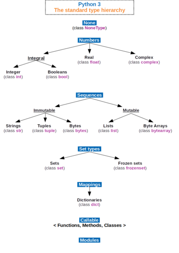 Das Typsystem von Python ist auf das Klassensystem abgestimmt. Obwohl die eingebauten Datentypen genau genommen keine Klassen sind, können Klassen von einem Typ erben. So kann man die Eigenschaften von Zeichenketten oder Wörterbüchern erweitern – auch von Ganzzahlen. Python unterstützt Mehrfachvererbung.