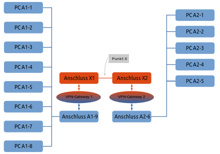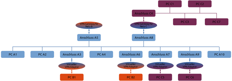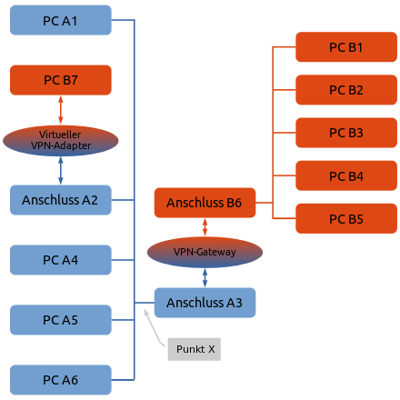 Bezogen auf die Beispielabbildung läuft auf dem Gerät mit Netzwerk-Anschluss A2 eine VPN-Client-Software, die dem Gerät das Netz B zuordnet. Aus vormals PC A2 wird dadurch der „Netz B“-Teilnehmer PC B7, unser VPN-Partner.